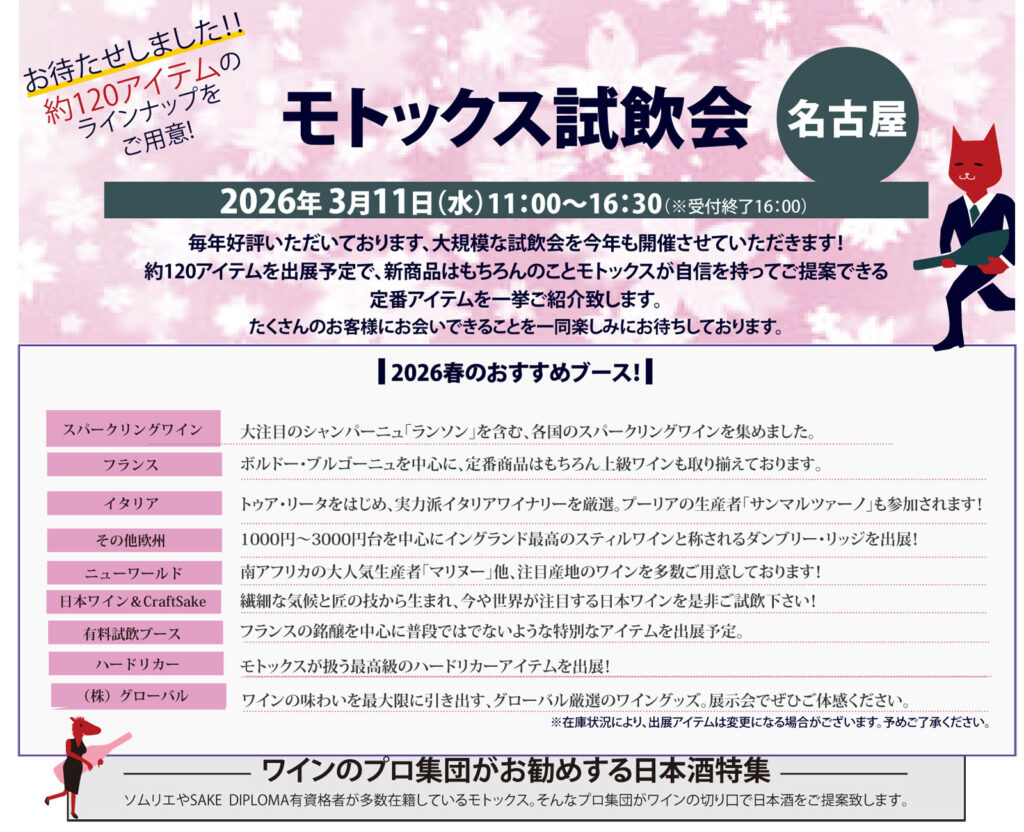 【3/11(水)名古屋開催】大規模120アイテムが集結! 「モトックス試飲会 名古屋」に弊社グローバルも出展!