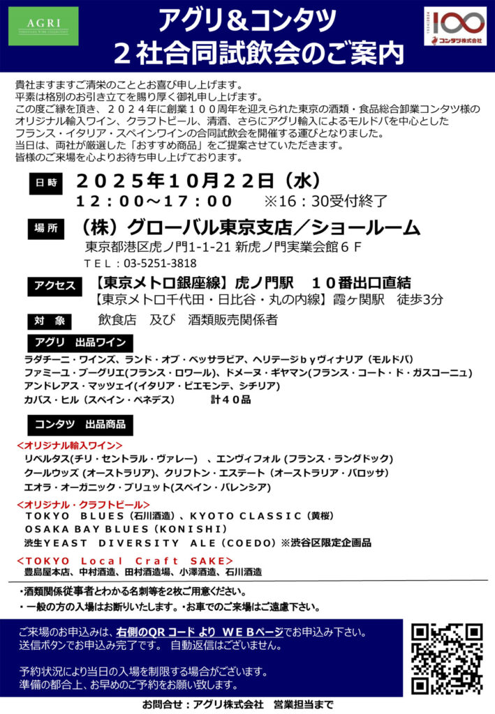 アグリと、創業100周年を迎えた老舗の酒類・食品総合卸業コンタツ株式会社がタッグを組んで開催するこのイベントは、世界各地のワインから、日本のクラフトビールや地酒まで、幅広いラインナップが一堂に会する貴重な機会です 。
