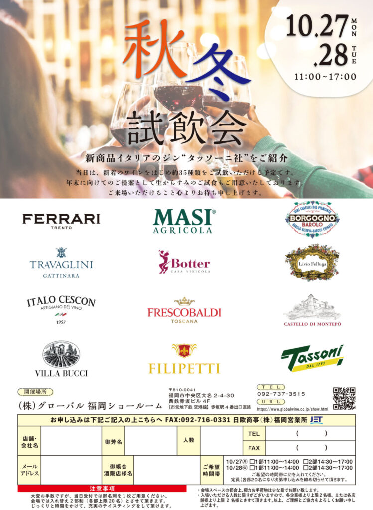 **2025年10月27日(月)および28日(火)に、グローバル福岡ショールームにて、日欧商事株式会社様主催の『秋冬試飲会』**が開催されます。