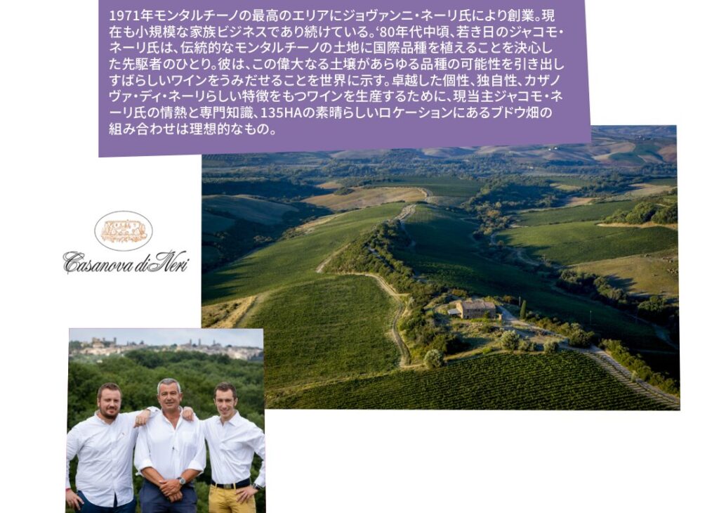 - **ブルネッロの名門【Casanova di Neri(カザノヴァ・ディ・ネーリ)】**の3代目、Gianlorenzo Neri 氏が来日し、会場にて直接お話いただけます。