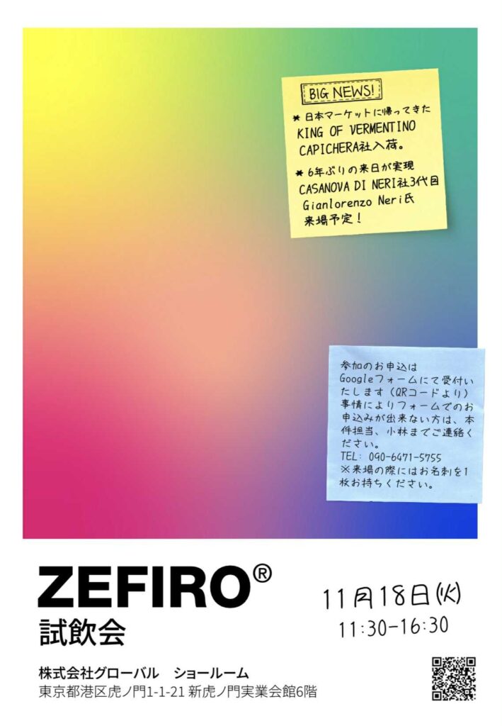 2025年11月18日(火)に東京・虎ノ門において、2024年設立のイタリアワイン輸入会社 ZEFIRO JAPAN株式会社主催の試飲会が、グローバル 東京ショールームにて開催されます。
