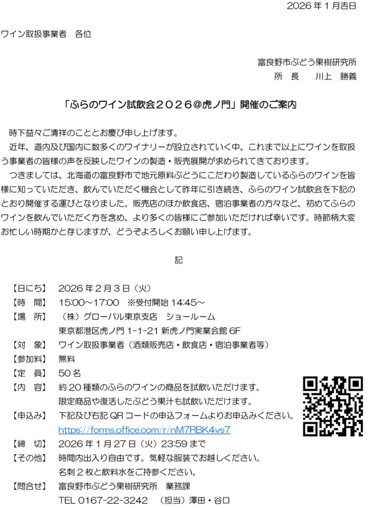 「ふらのワイン試飲会2026」が、東京・虎ノ門のグローバルショールームにて開催されます。