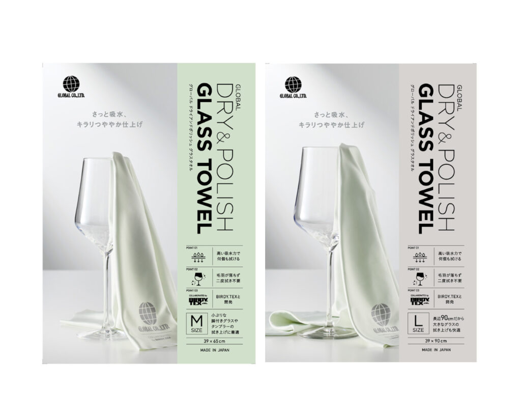 洗い上げたグラスの水滴を高い吸水性で拭いとり、つややかに磨き上げまでこれ一枚で対応できる高機能グラスタオル。