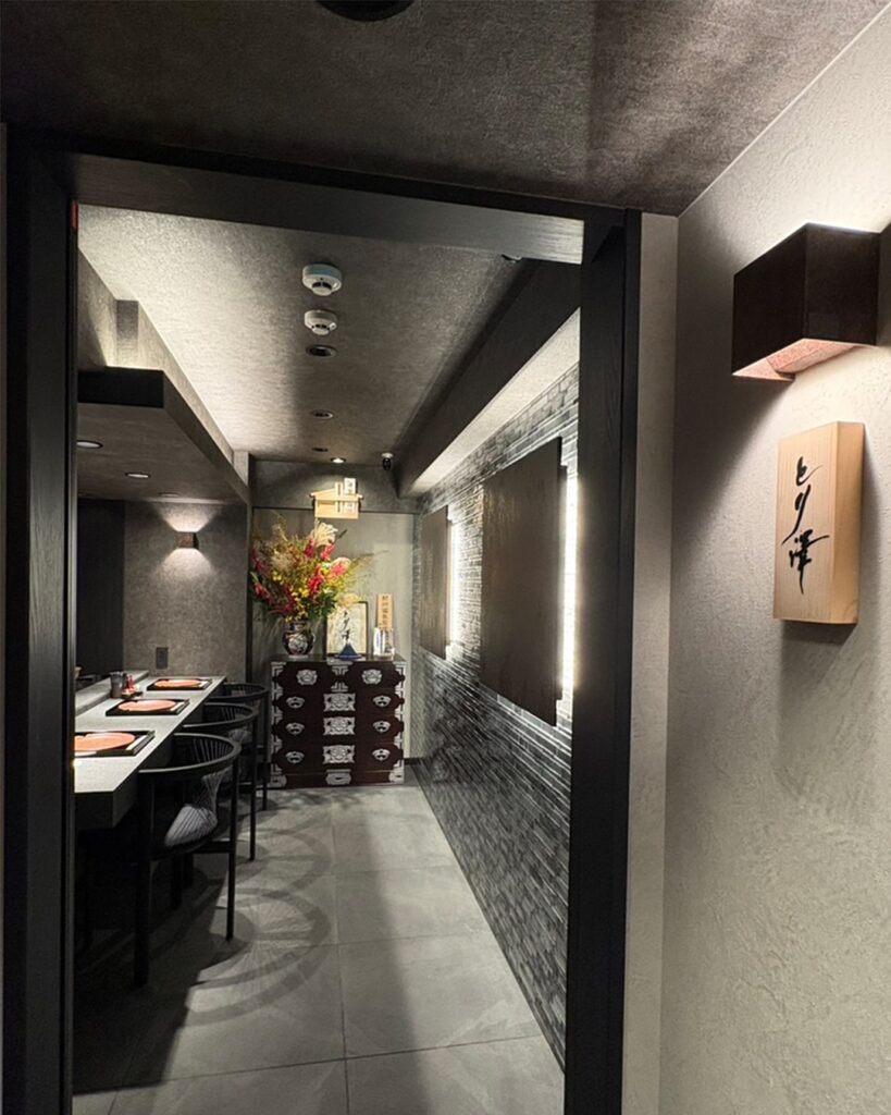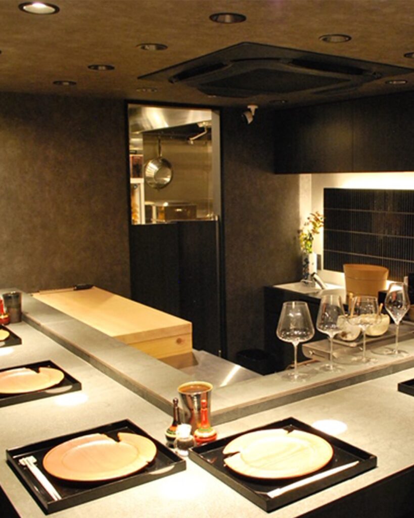 黒とグレーを基調にしたシックな店内には、7席のみのL字カウンターが設えられ、まさに“大人の隠れ家”と呼ぶにふさわしい特別感を放っている。