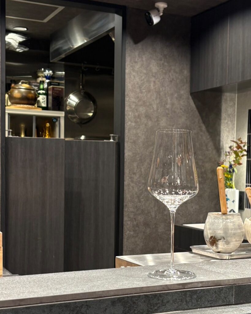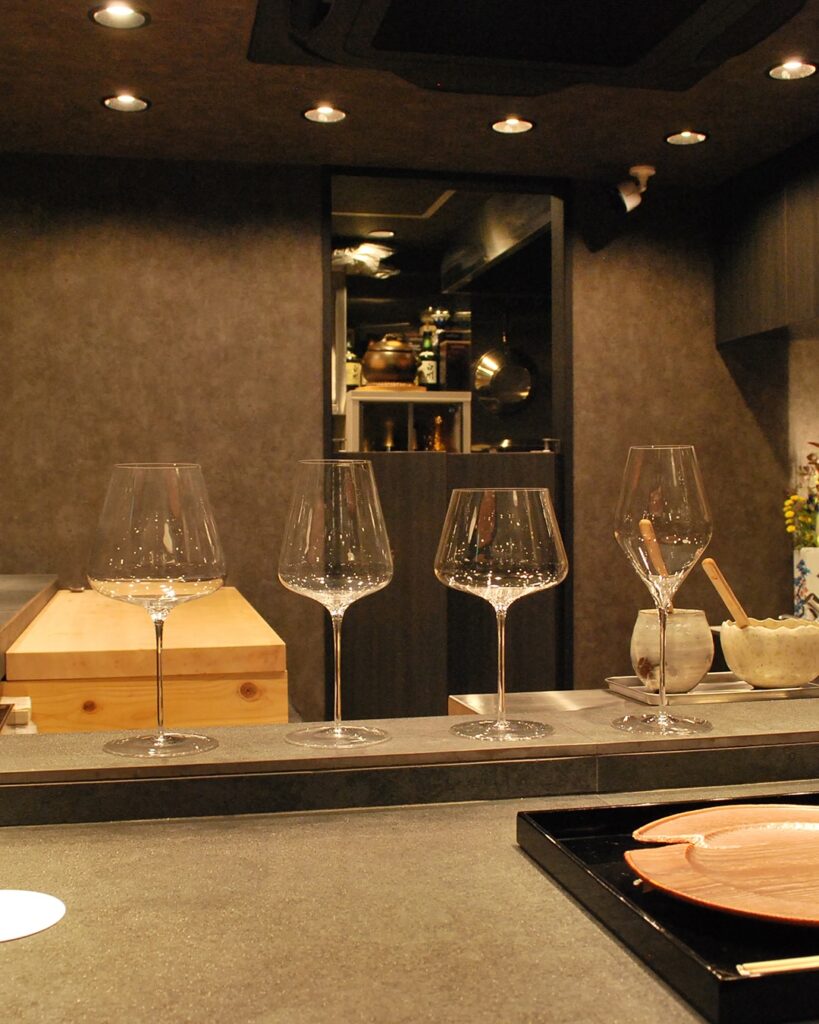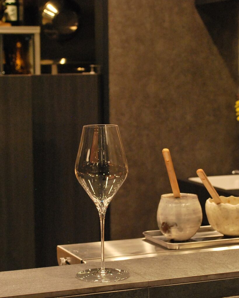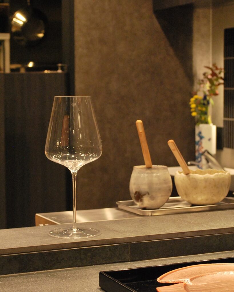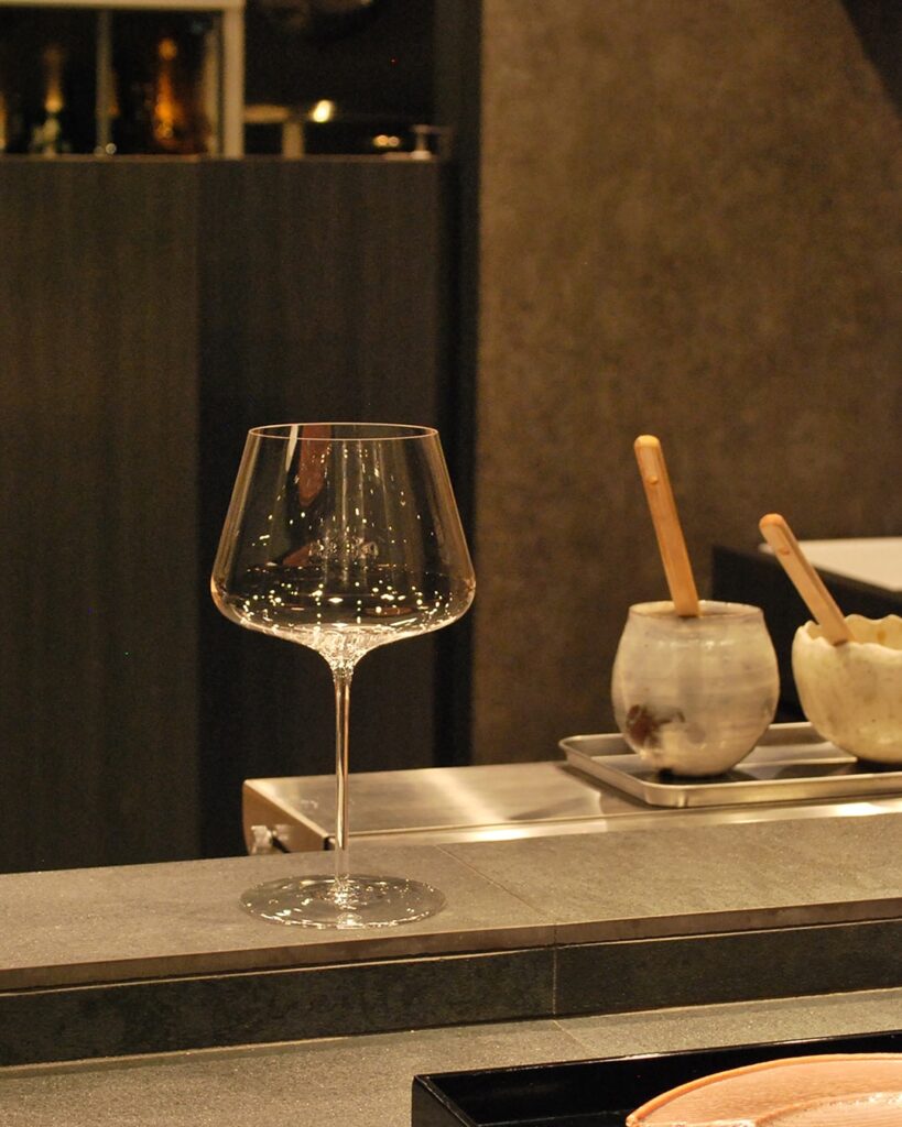 料理に寄り添うように選び抜かれたワインや日本酒も魅力で、その香りや味わいを最大限に引き立てるため、グラス選定にも強いこだわりが感じられる。
