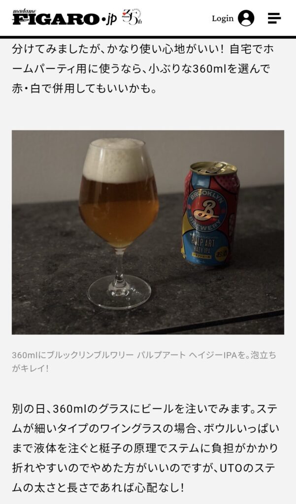 人気ライフスタイル&グルメメディア フィガロジャポン(Madame FIGARO.jp) の「ワインもビールもカクテルも!自宅飲みに『ちょうどいい』グラス、見つけました。」という記事で、弊社のショートステムグラス 『UTO(ウト)』 が取り上げられました!【引用元:フィガロジャポン】