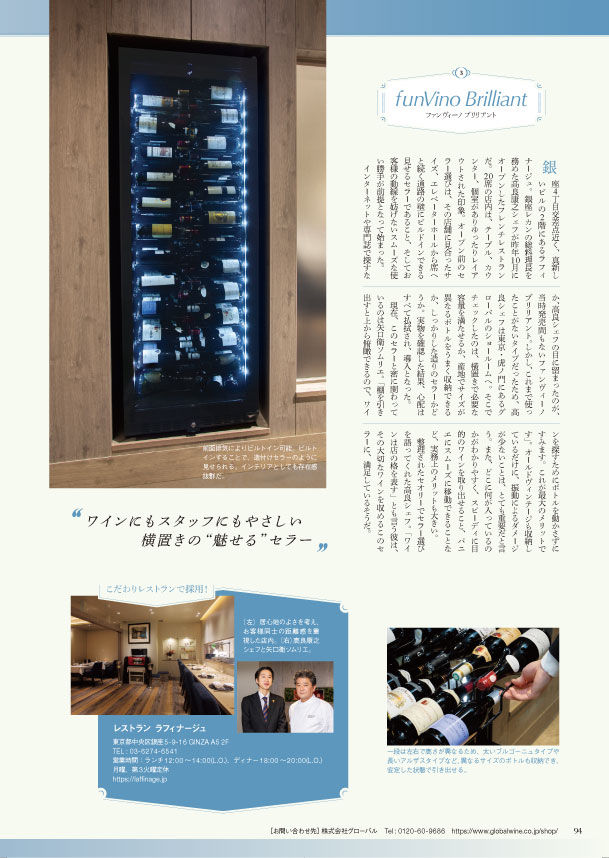 インターネットや専門誌で探すなか、高良シェフの目に留まったのが、当時発売間もないブリリアント。しかし、これまで使ったことがないタイプだったため、高良シェフは東京・虎ノ門にあるグローバルのショールームへ。そこでチェックしたのは、横置きで必要な容量を満たせるか、産地でサイズが異なるボトルをうまく収納できるか、しっかりした造りのセラーかどうか。実物を確認した結果、心配はすべて払拭され、導入となった。