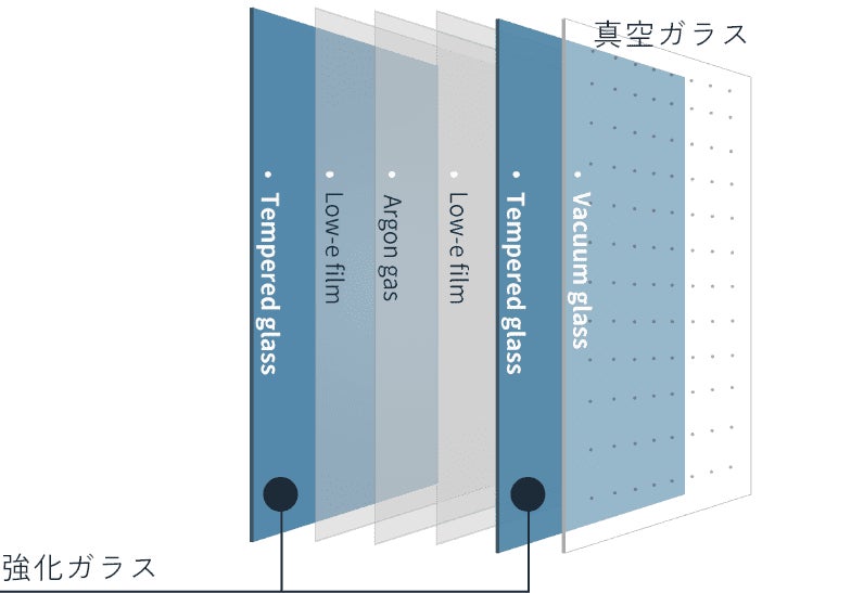「Low-Eガラス」は、2枚の強化ガラスの内側に「Low-Eフィルム」を施し、さらにガラス層の間にアルゴンガスを封入することで断熱性を高めた構造です。紫外線を防ぐUVカット効果も備え、ワインの保管環境にも配慮しています。