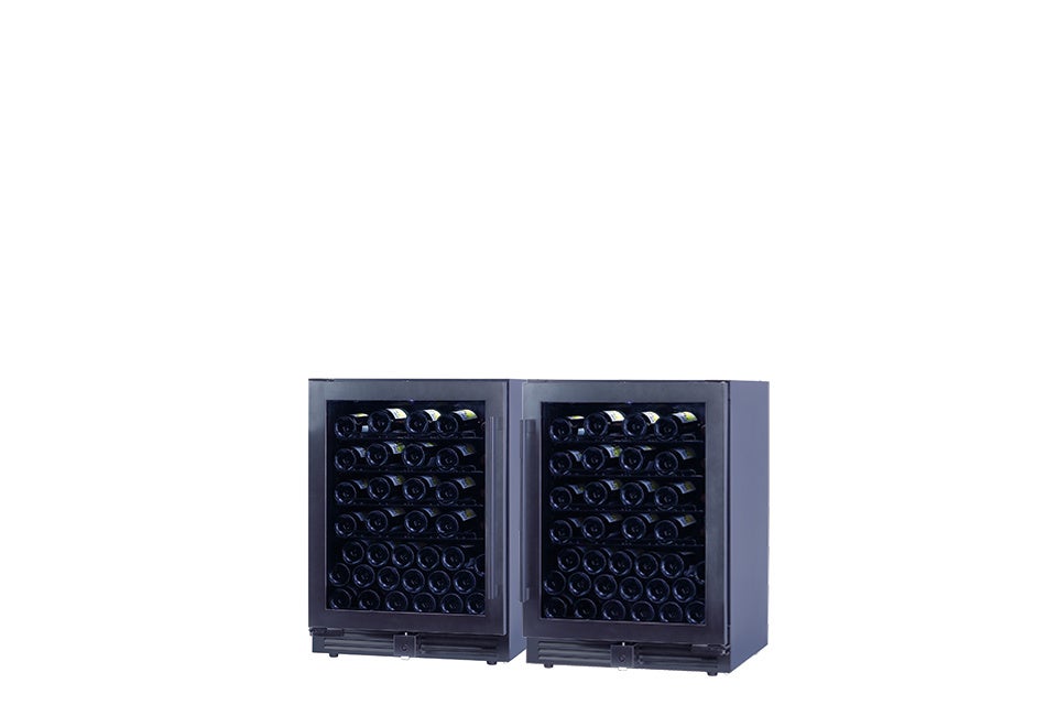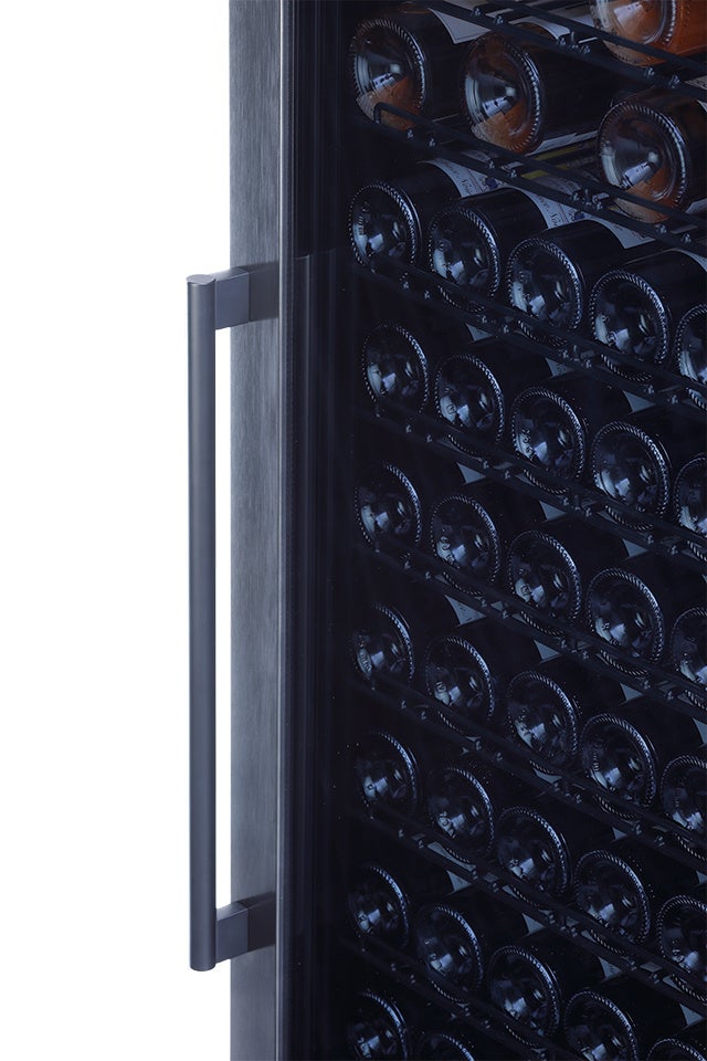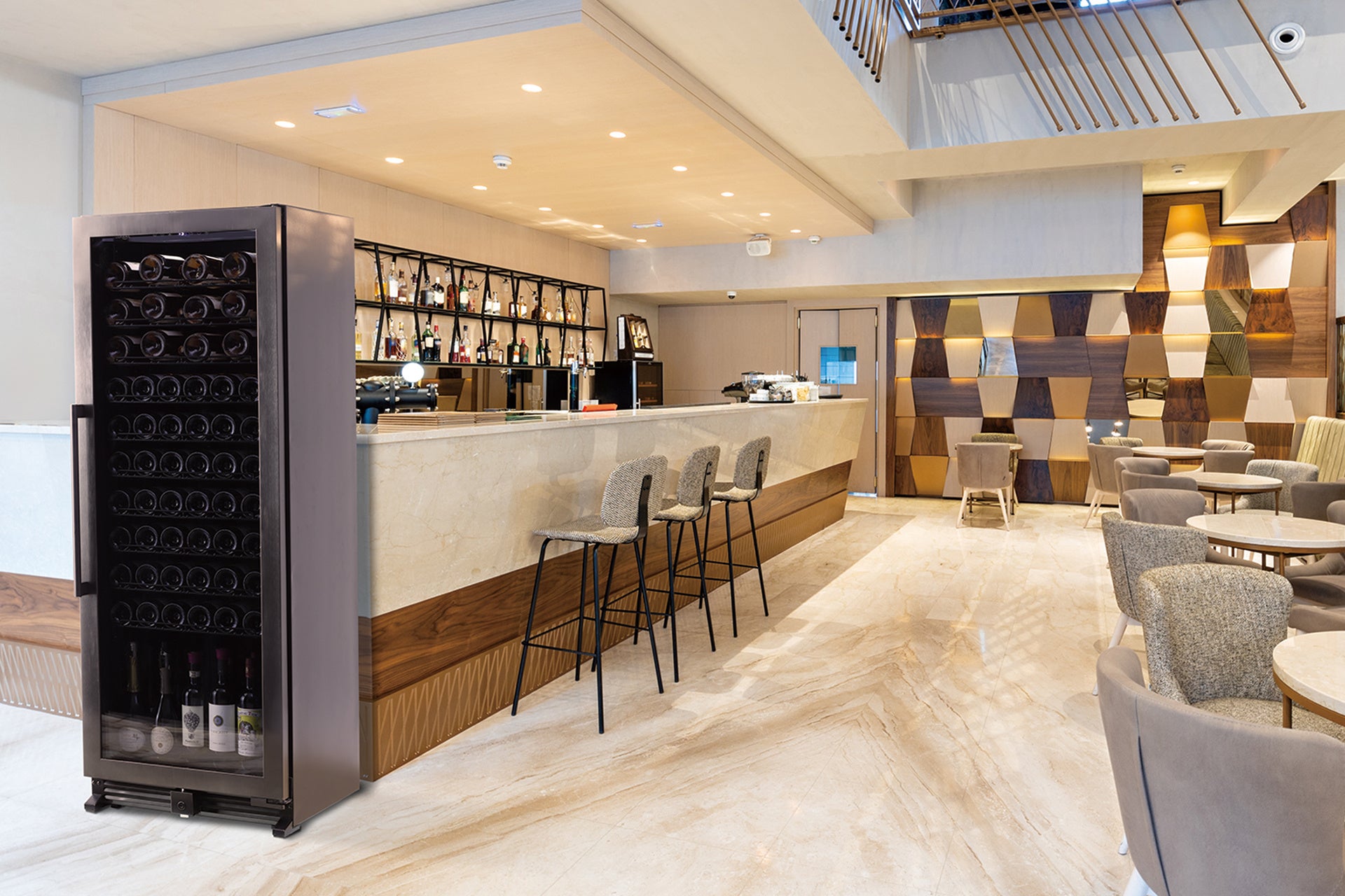 奥行約53cmの薄型設計により、通路やバックヤードなど限られたスペースにも設置しやすい、84~108本収納の1温度帯ワインセラーです。