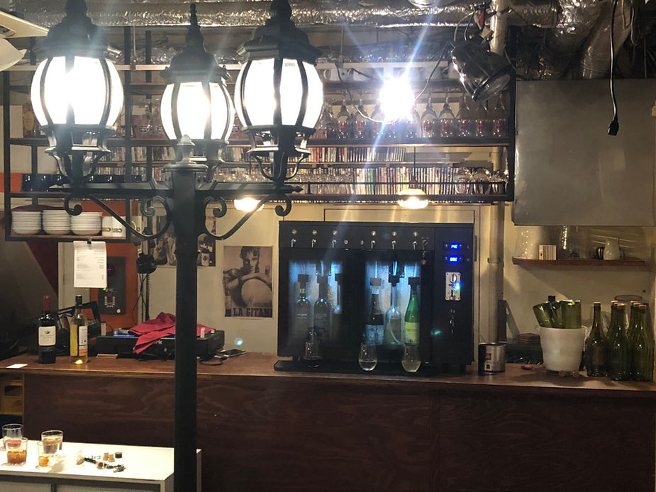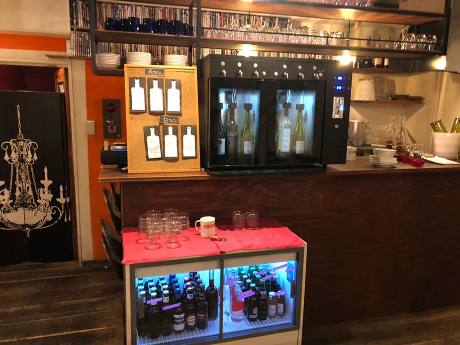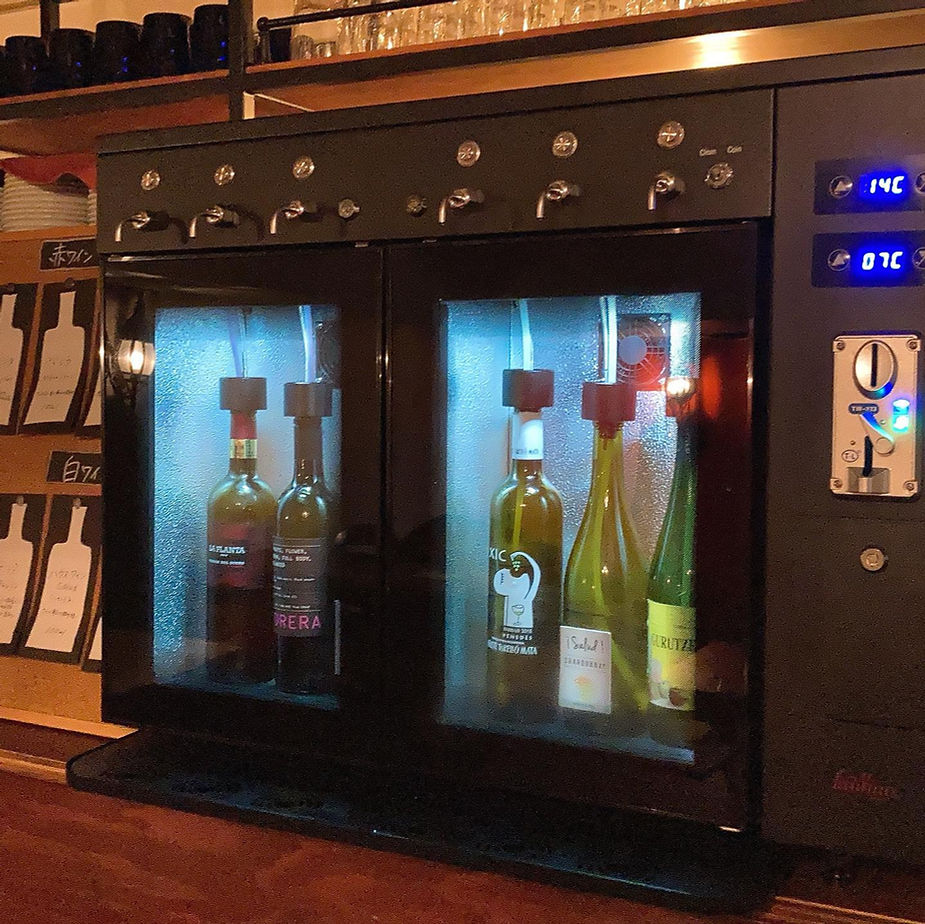 その地下フロアへ料理は基本スタッフが運ぶが、アルコール・ドリンク類に関しては全てセルフ形式。ビール、ソフトドリンクは冷蔵庫から、ワインはファンヴィーノ ワイン・Sakeサーバーを活用して、お客様に自身で楽しみながら注いでいただく。