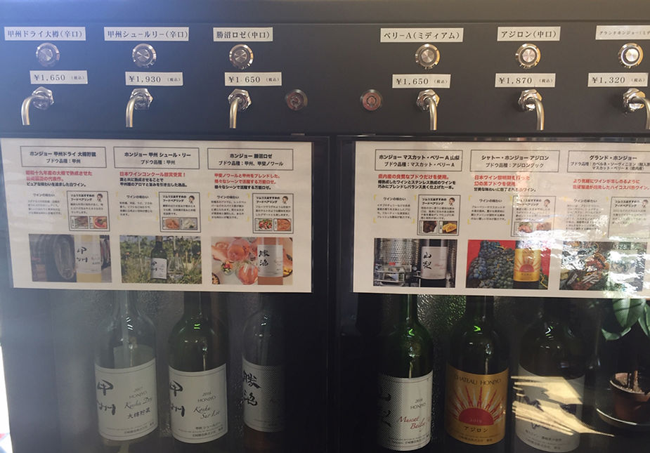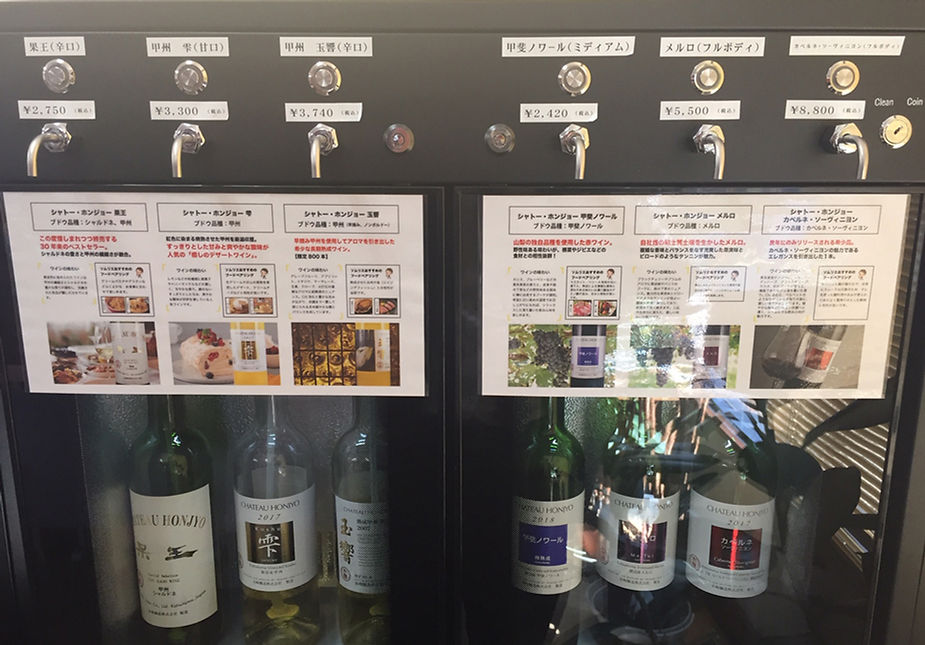 2台のサーバーにて、白ワイン6種、赤ワイン6種の計12種が試飲できるようになっており、コイン3枚で500円。価格帯の違いにより、それぞれ1枚で15cc、30ccが自動的に抽出されるように設定されてある。