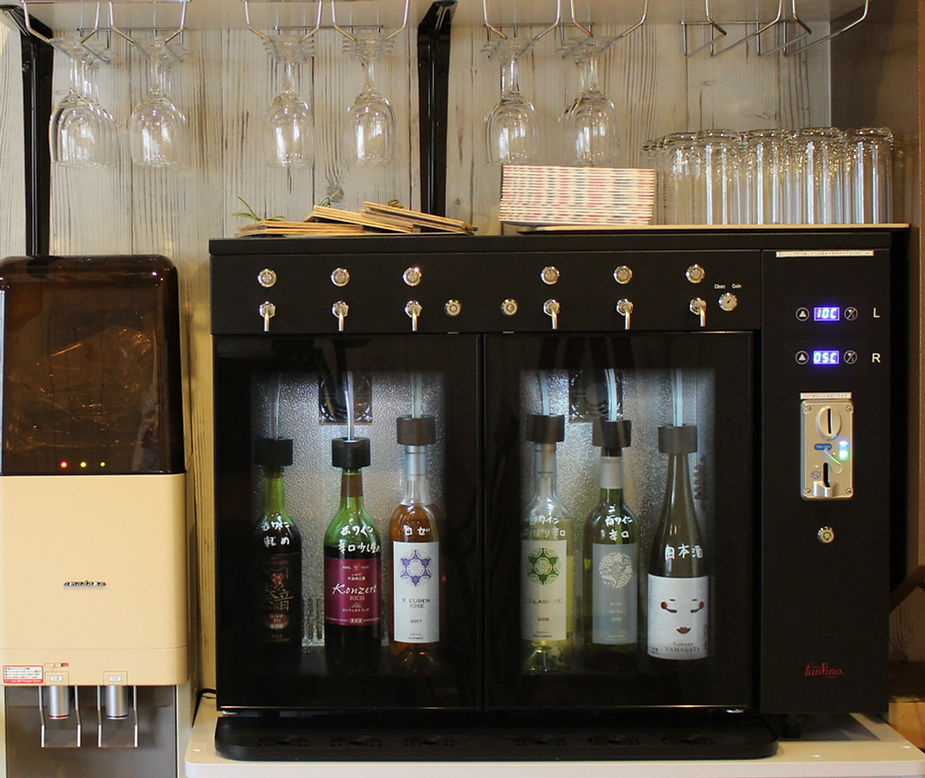 ファンヴィーノ コイン式ワイン・Sakeサーバー 6本用 の左庫は10度に設定し、赤ワインとロゼワインを。右庫は5度設定で白ワインと日本酒を提供している。ワインは70ml、日本酒は90ml設定にし、ワンコイン500円で提供。ワイングラスもサーバーの上に、吊り下げグラスラック設置で、スタッフが対応するのは、両替えとボトル交換程度で、当初の導入目的通り省人化に繋がっている。